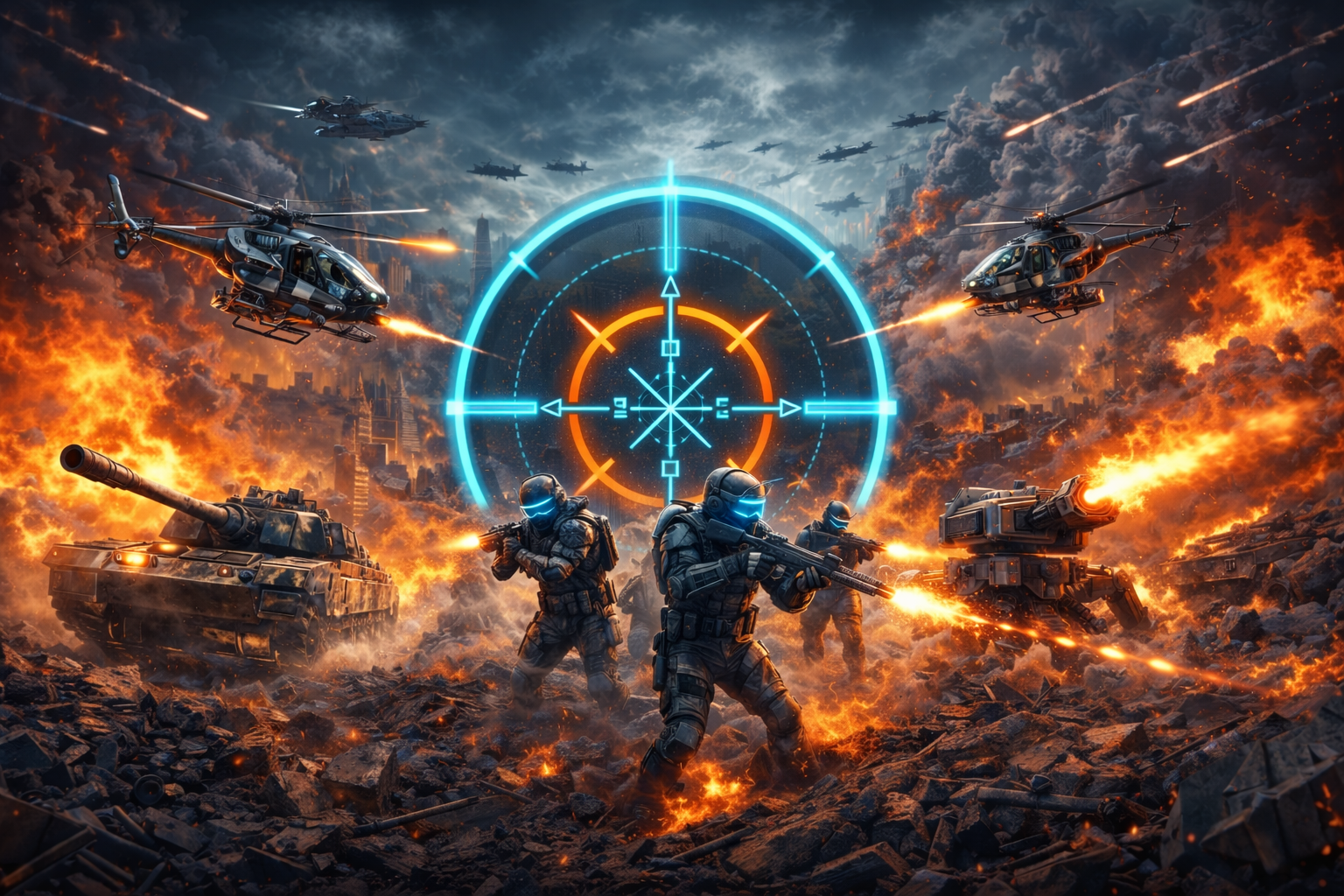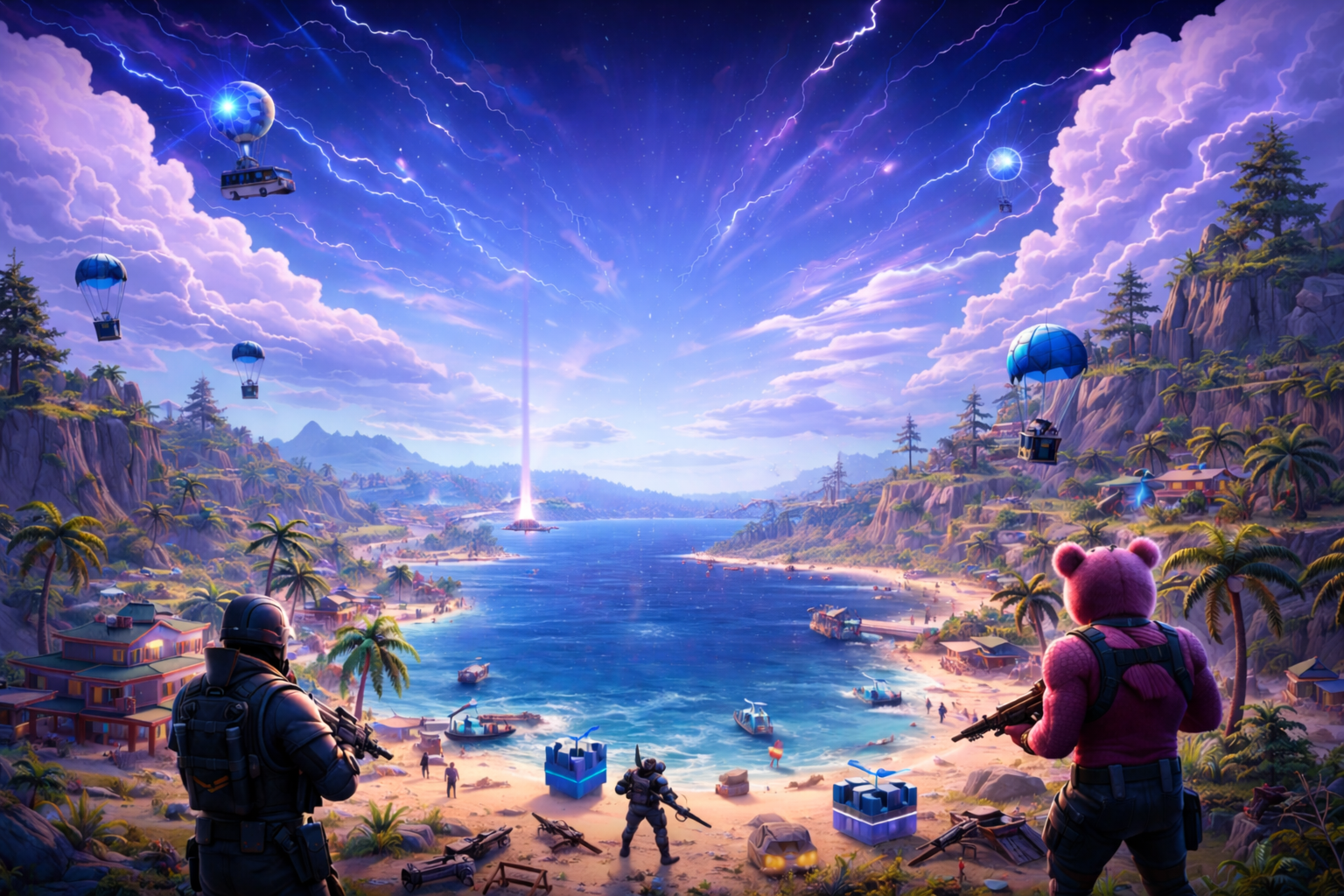 Battle royale ad alta intensità. Zone di loot, shrinking zone, kill feed in tempo reale.
